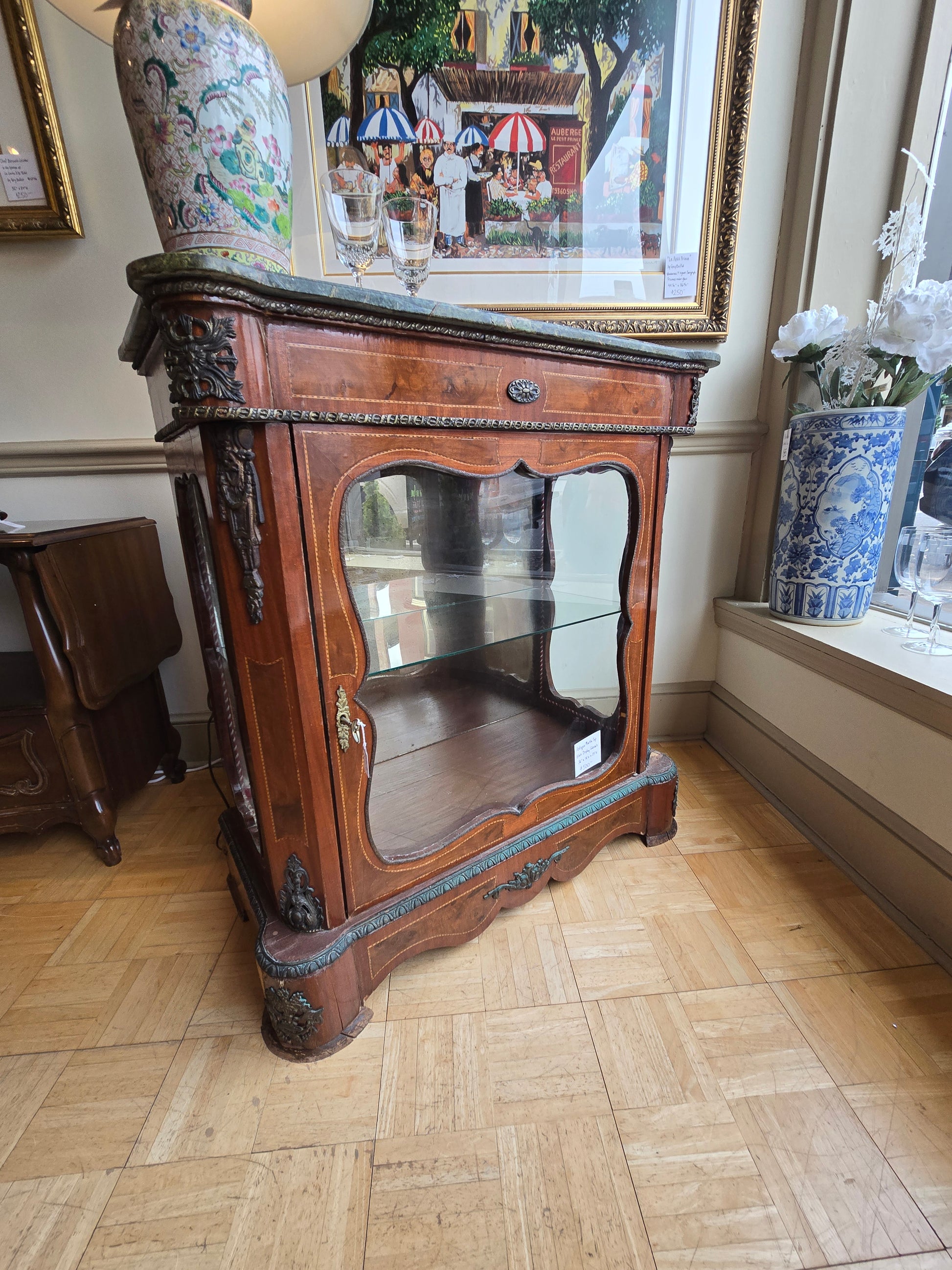 Antique glass front display cabinet with green marble top. Back wall of cabinet is a mirror. Original skeleton key included! Marble top is removable for easy transport.