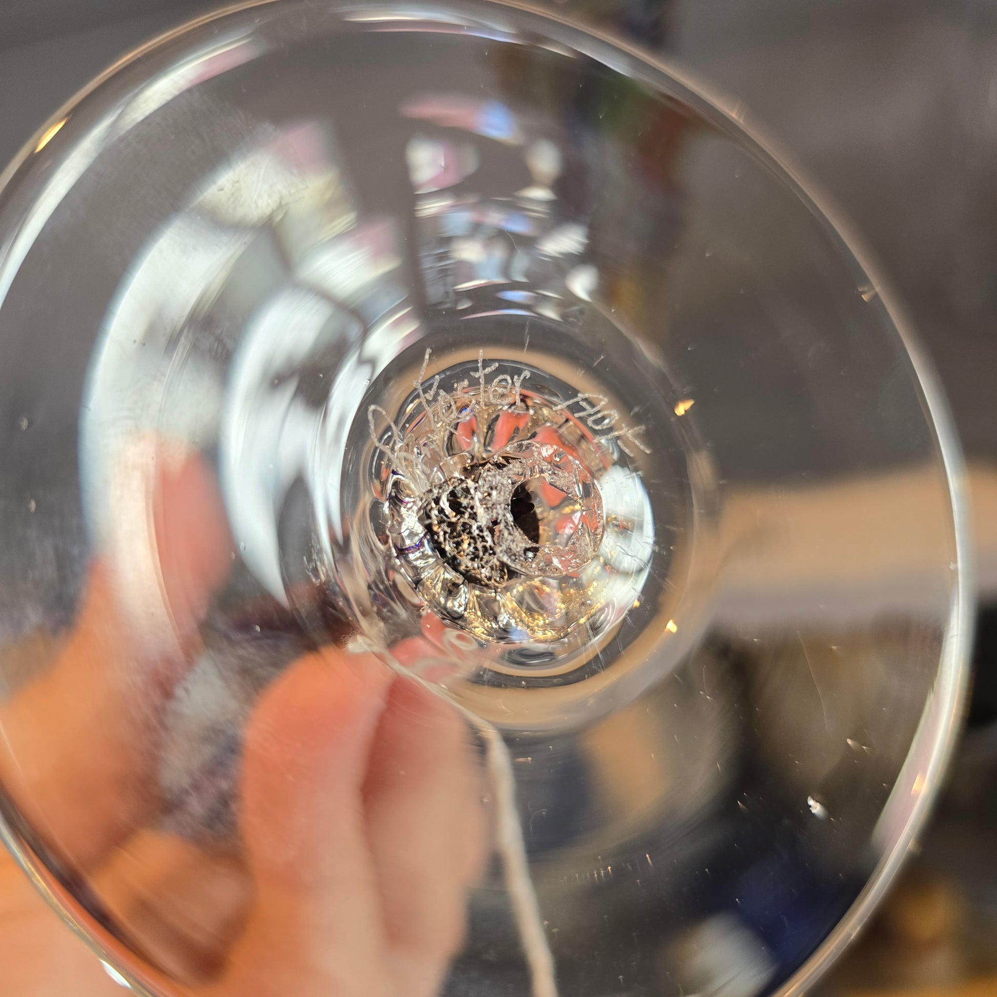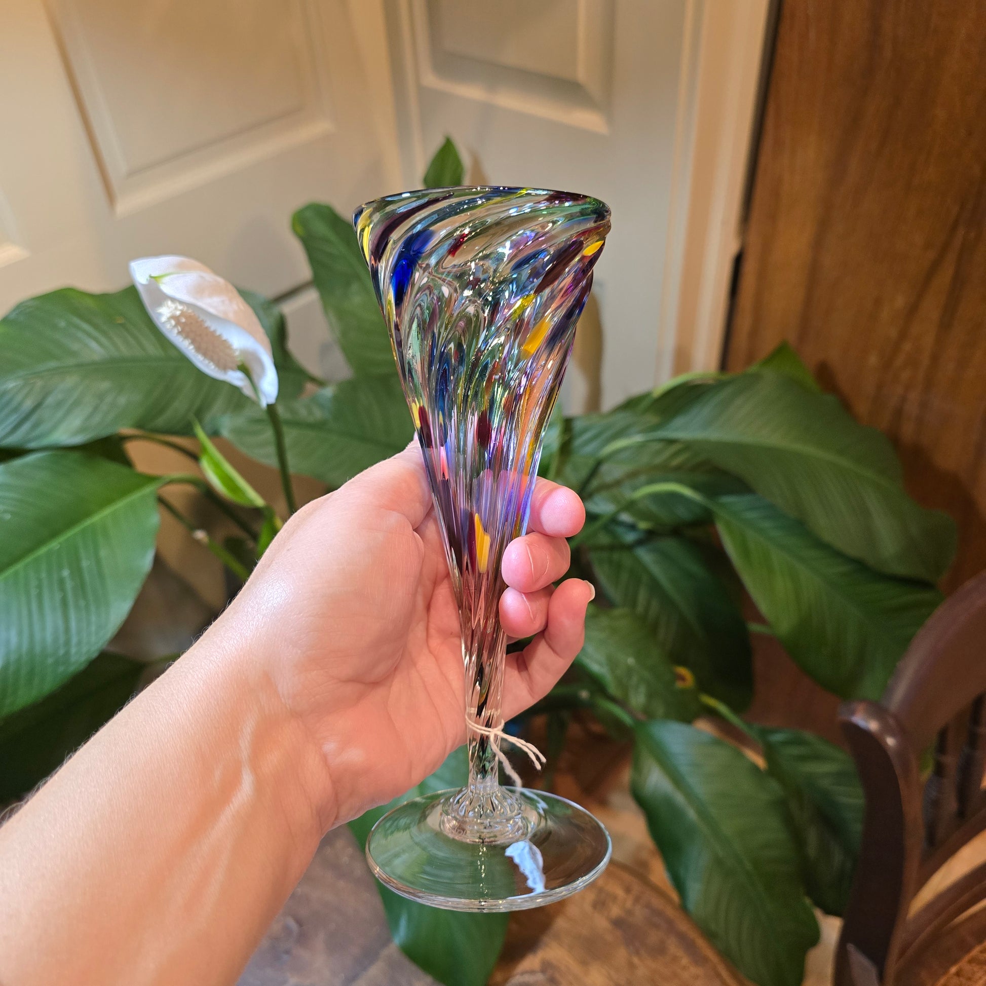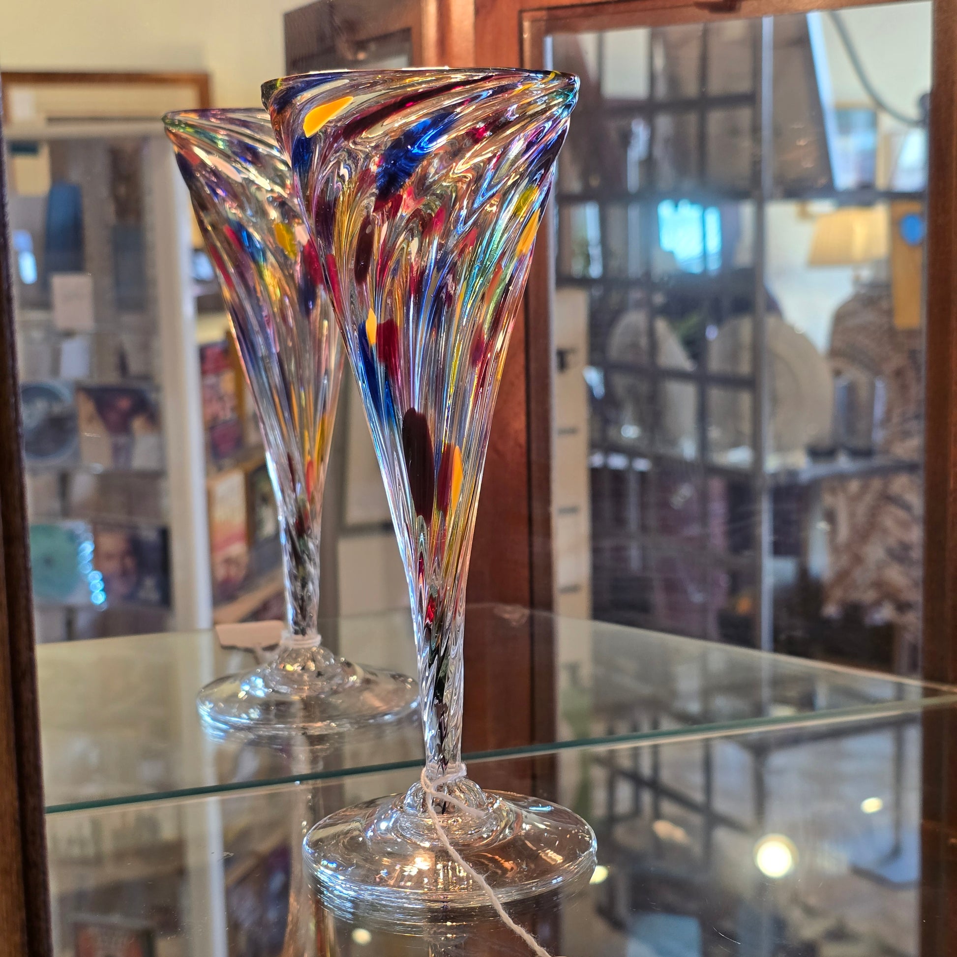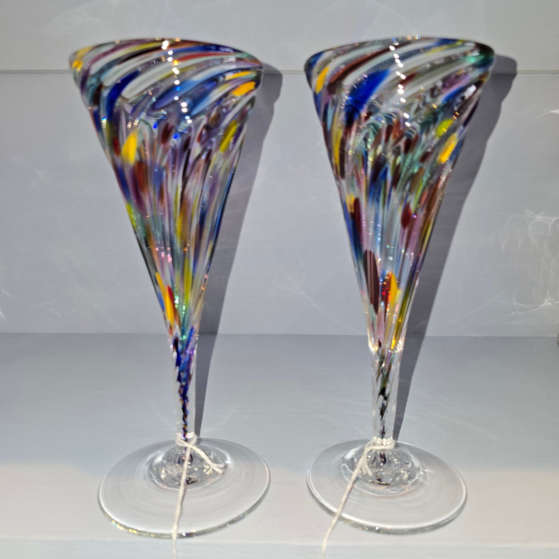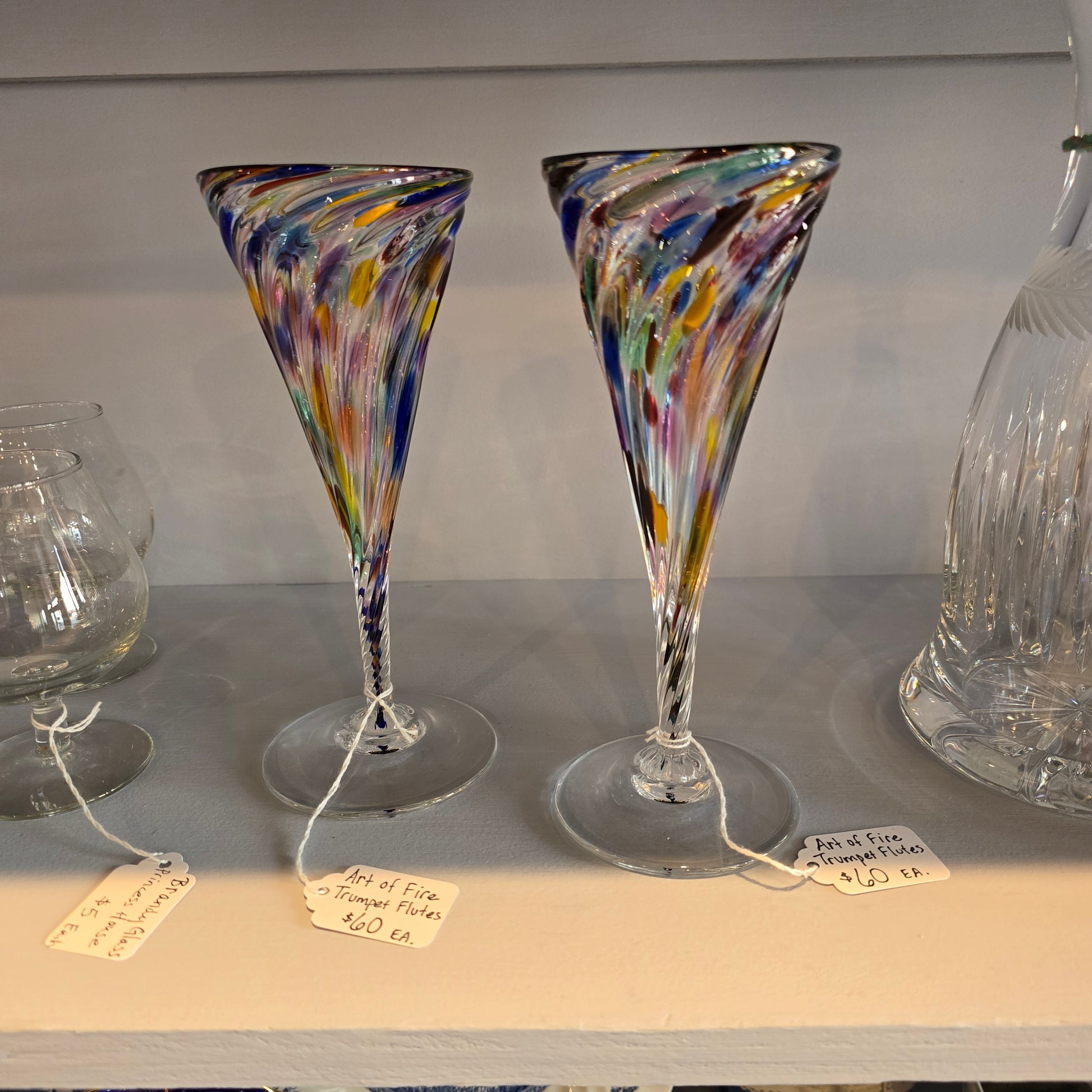 Multi color trumpet flutes signed by R. Foster. Hand crafted in the Art of Fire Studio in Maryland. Gallery price is $155-315 each on this style of stemware.
